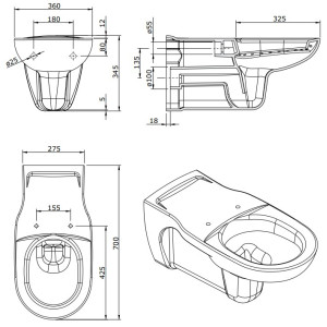 WC suspendue fixé au mur avec sortie arrière avec trou
